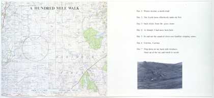Land artists such as Hamish Fulton and Richard Long use walking as a way of exploring landscapes. Hamish Fulton records his experience of the walks he makes in poetic texts. In Wind through the Pines 1981 the things he sees, hears and experiences are transformed into descriptive sentences or single words which together evoke the sense of journeying through a landscape. Richard Long’s A Line Made by Walking creates a temporary sculptural intervention in the landscape as the route he takes across a field flattens the grass and becomes a trace of his journey.