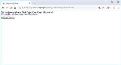 Emerging in the 1990s, net art employs and is made for the internet and its users. It counts on the fast pace, unlimited possibility and freedom that the platform can offer. The impermanence that MoMA initially proposed for its collection is a common characteristic of net art. Achim Wollscheid’s Nonrepetetive 2011 was closed after only a year;4 the Infrequency Podcasts series, hosted on the same Intermedia Art webpages as the net art commissions, directs to a page now displaying the error message ‘[that] XML file does not appear to have any style information associated with it’ (fig.2).5 You might try to figure how the ‘document tree’, the lines of text coding that appear below the message, relates to the work, and when it crashes, ‘You can wait for it to become responsive or exit the page’. For other works ‘You need[ed] to upgrade your Flash Player’ (fig.3) but the browser you use no longer supports the outdated plugin the artwork ran on.6 Annet Dekker sums up the speedy obsolescence of net art works: ‘it’s important to acknowledge that [net art] is never stable – since technological changes and updates continuously shape the work – and to see them as localised and specialised entities in time, both in the sense that they can be time-based and that their appearance may vary over time.’7 Without institutional support, artists are also expected to maintain their artworks themselves, taking on the cost of paying for domain names and security updates. This can of course be prohibitive, further contributing to the work’s impermanence. When they are hosted by institutions like Tate, updates to the larger website can render them either non-functional or difficult to find.