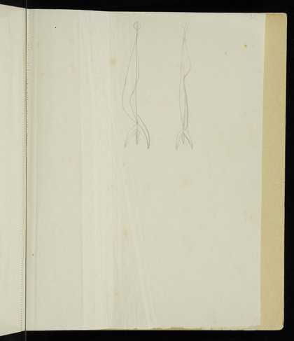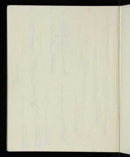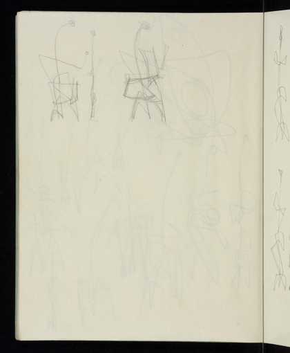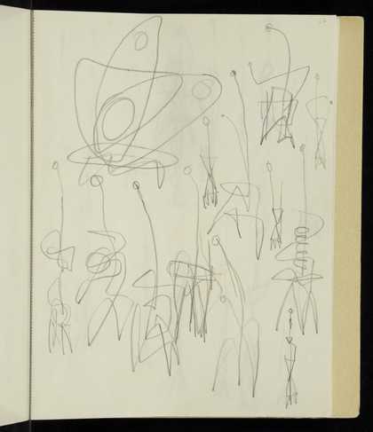 Outline studies for abstract figures, some with upraised arms holding a ball