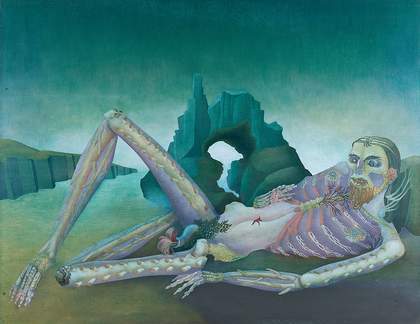 Unlike Fini, Colquhoun is not interested in depicting the figure as full or rounded. Instead, she produces craggy figures, hairy with seaweed, who double as rocks and cliffs, becoming integral parts of the landscapes they reside in. DZܳdzܲ’s figures have a brutal physicality to them that is intensely personal to her work. In another painting, Scylla 1938, the thighs, which are the focus of the picture and double as rocky pillars, are covered with cascading, impossible folds, both flesh and rock. Looking at them, I imagine I am feasting on oysters while realising that their shells, strewn on the beach, have cut my feet to ribbons.