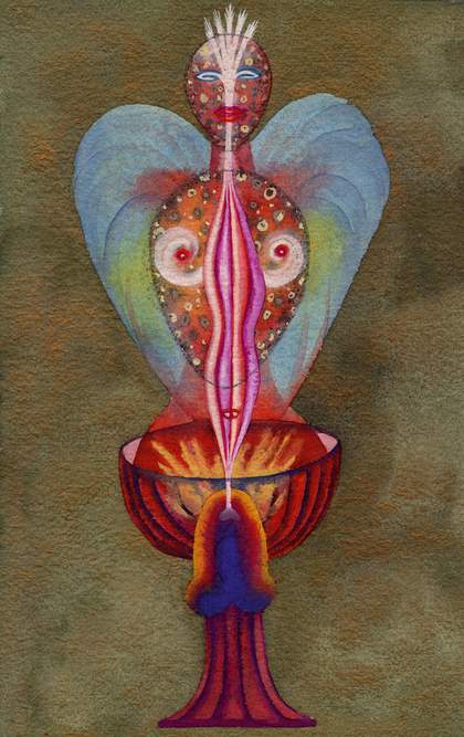 I’m sure Carl Jung and Sigmund Freud knew of the language and sacred texts of Tantra, just as I’m sure the surrealists looked at the imagery. Colquhoun did both, I imagine, and understood that she could tap into things, perhaps higher forces, that would bring her work into being. Powers, that is, that summon all the convergences of life to paper and body, hand and mind, in the automatism that Colquhoun learnt to trust in her work as messages and codes. She had faith in the potential of what could come to be, and if there were few clear directions, no matter: she made her own, harnessing her body as her own sacred instrument, much as a hatha yogini would. I see it in the work because I feel it in the work. This is the potential art has to cross every axis – to make you feel form and colour, negation and presence. And so DZܳdzܲ’s works become thresholds of possibility and openings of doors.